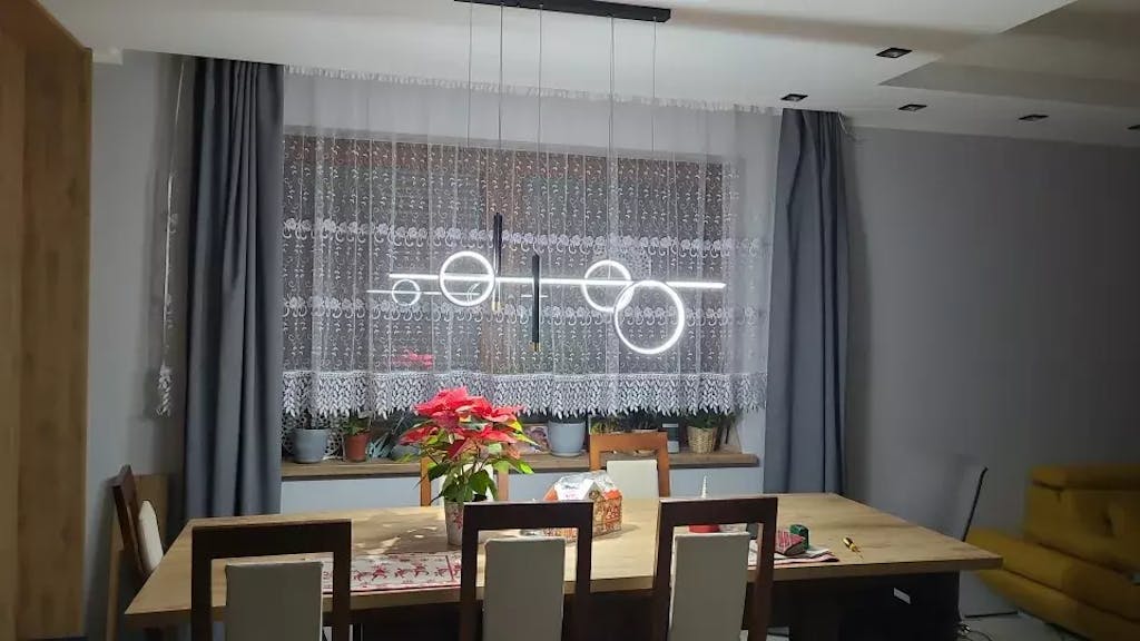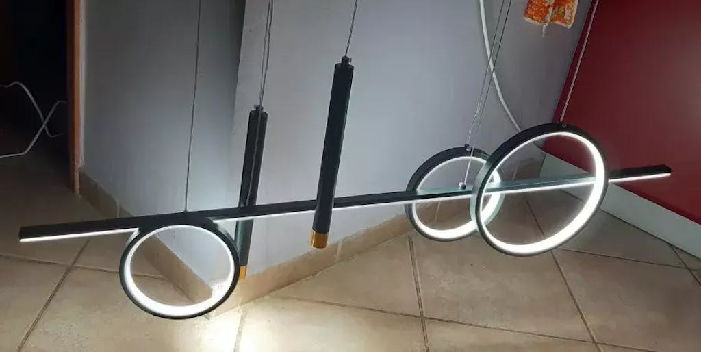 Ses différents et nombreux points lumineux vous permettrons d'obtenir un éclairage optimal et chaleureux. Vous avez la possibilité de choisir la disposition des cercles et des barres afin que ce lustre s'adapte parfaitement à votre espace ! Ce lustre et son style très contemporain ira à merveille dans un espace moderne. Il apportera une note d'élégance supplémentaire dans votre pièce.